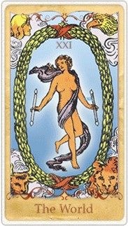 The World is an indicator of a major and inexorable change, of tectonic breadth. This change represents a chance for you to bring about a desirable end to the Old and a good beginning to the New. It is indicative of growing maturity, a sense of inner balance and deeper understanding. It suggests that you may be approaching a more final sense of identity, and the security in the self that comes with age. It also represents the falling away of boundaries, sometimes in the effusive sense of the spiritual, but sometimes in a purely physical sense, indicating travels or journeys in the future.